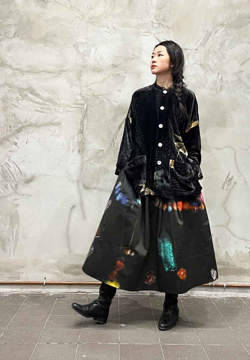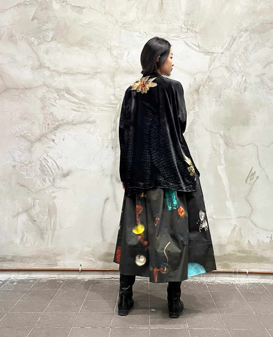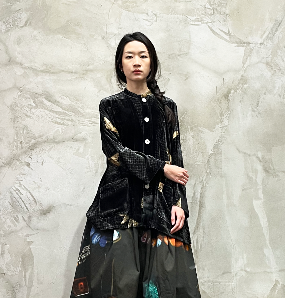 "Tailleur" printed silk velvet jacket with frontal buttons, long sleeves and patch pockets. Wide fit. Made in Italy.