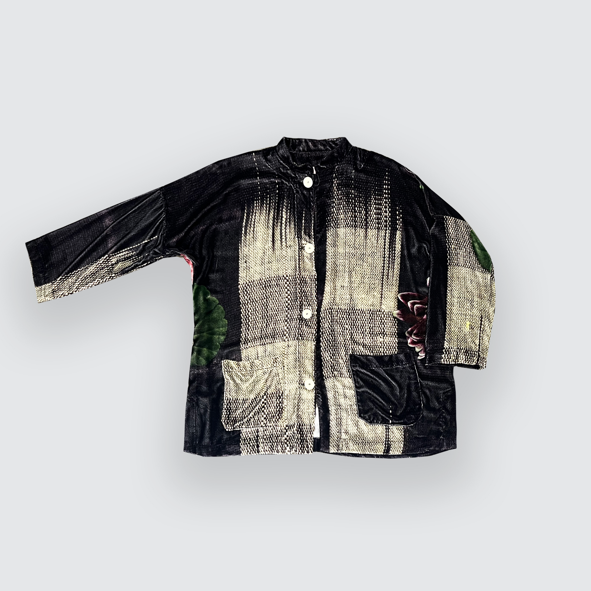 "Ikat" printed silk velvet jacket with frontal buttons, long sleeves and patch pockets. Wide fit. Made in Italy.