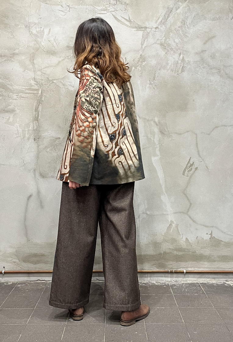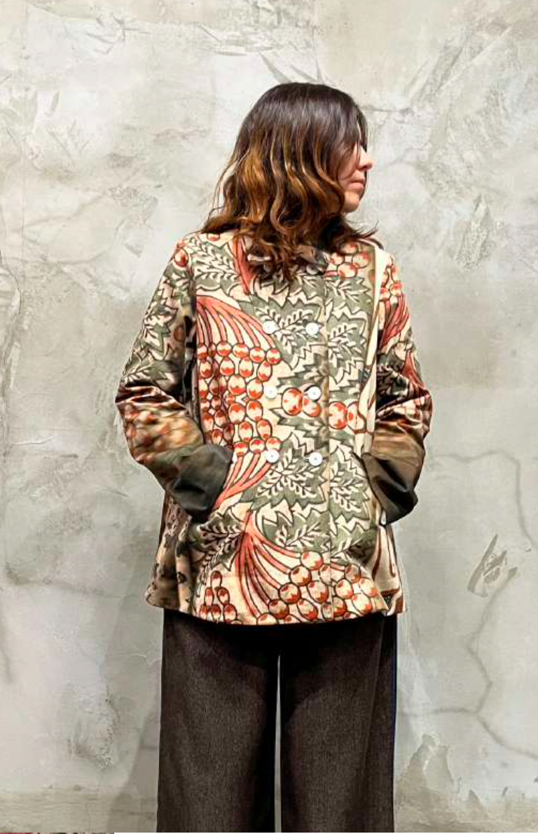 "Riga India" printed thick cotton satin double breasted coat. Corozo buttons and welt pockets on the front. Inside flannel lining. Regular fit. Made in Italy.