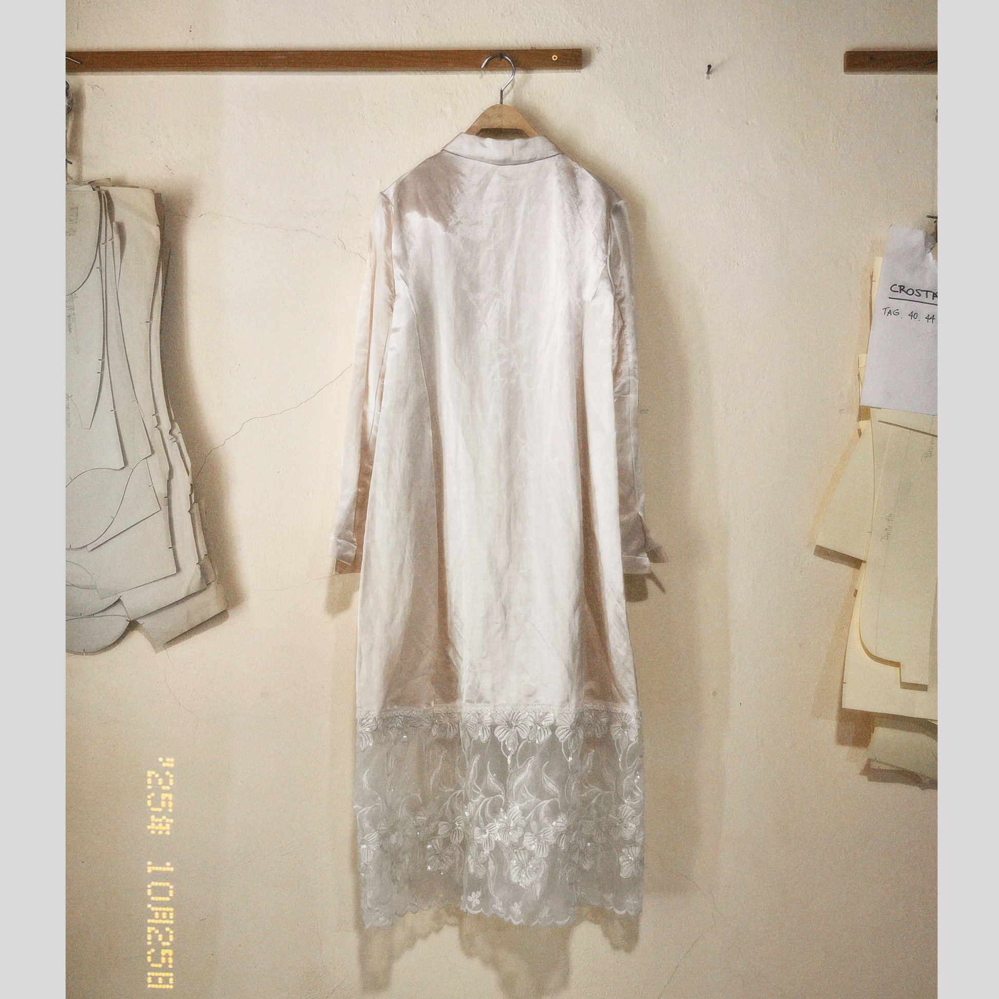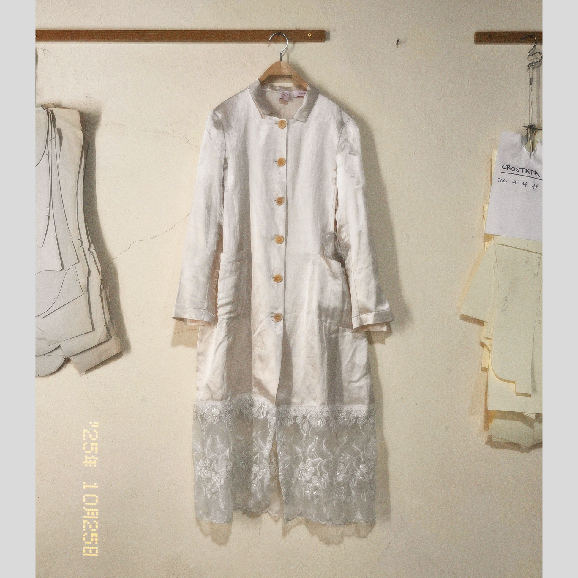 "Chicchissimo" shiny viscose linen milk white coat with applied pockets, corozo buttons and bride hem lace finishing. Regular fit. Made in Italy.