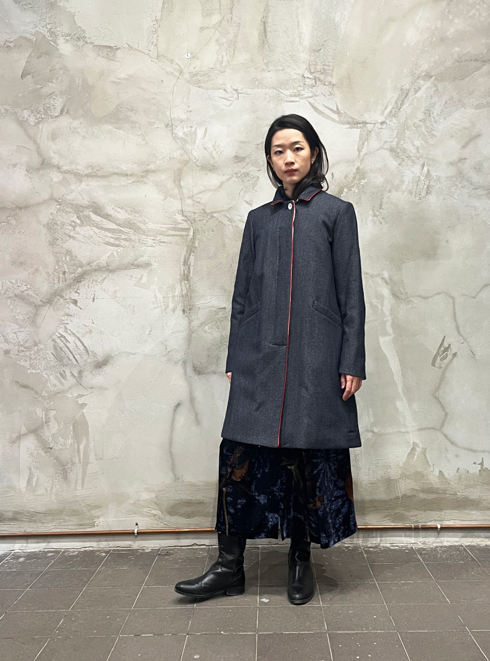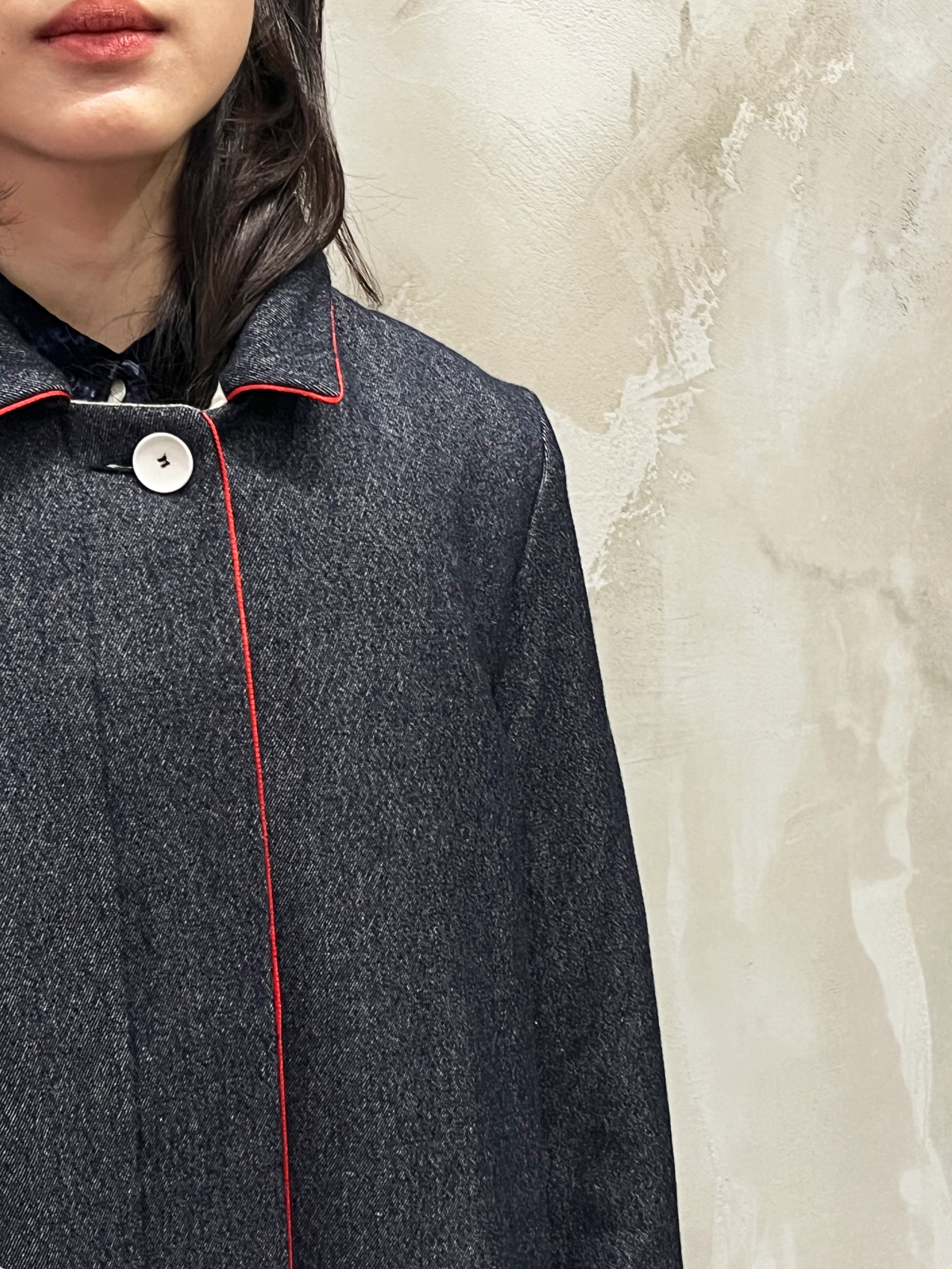 Warm blue wool denim effect coat with corozo buttons and welt pockets on the front. Decorative piping around neck and opening. Padded and inside lining. Regular fit. Made in Italy.