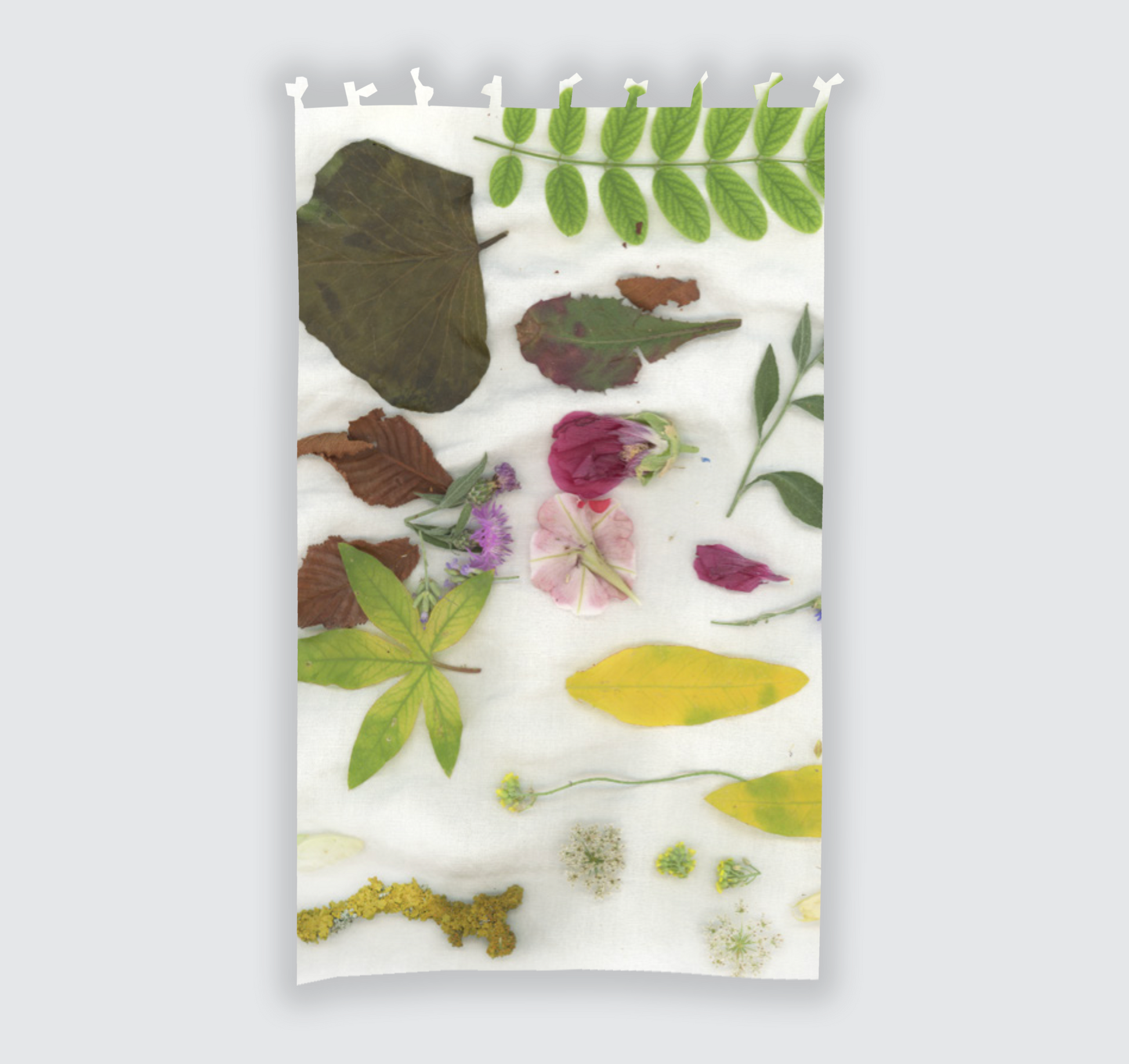 "Natura su lino" printed 100% cotton voile curtain with strings closure. Made in Italy.