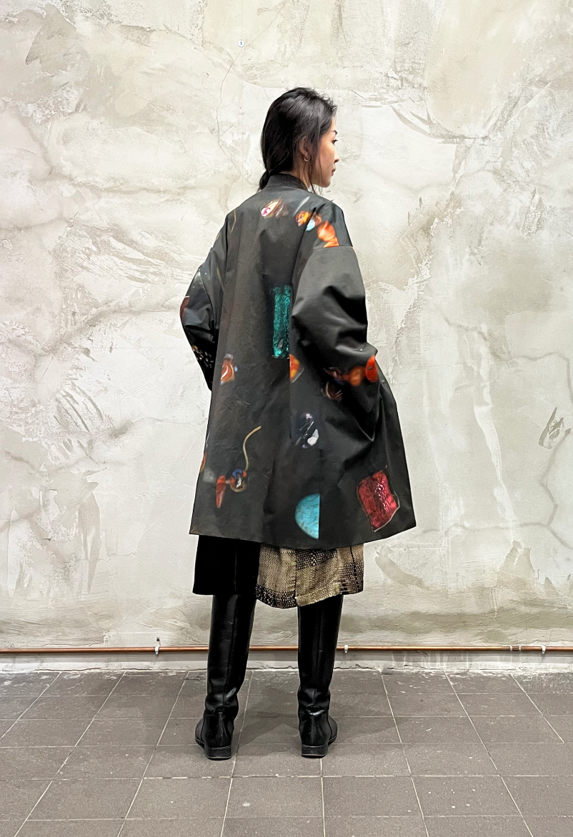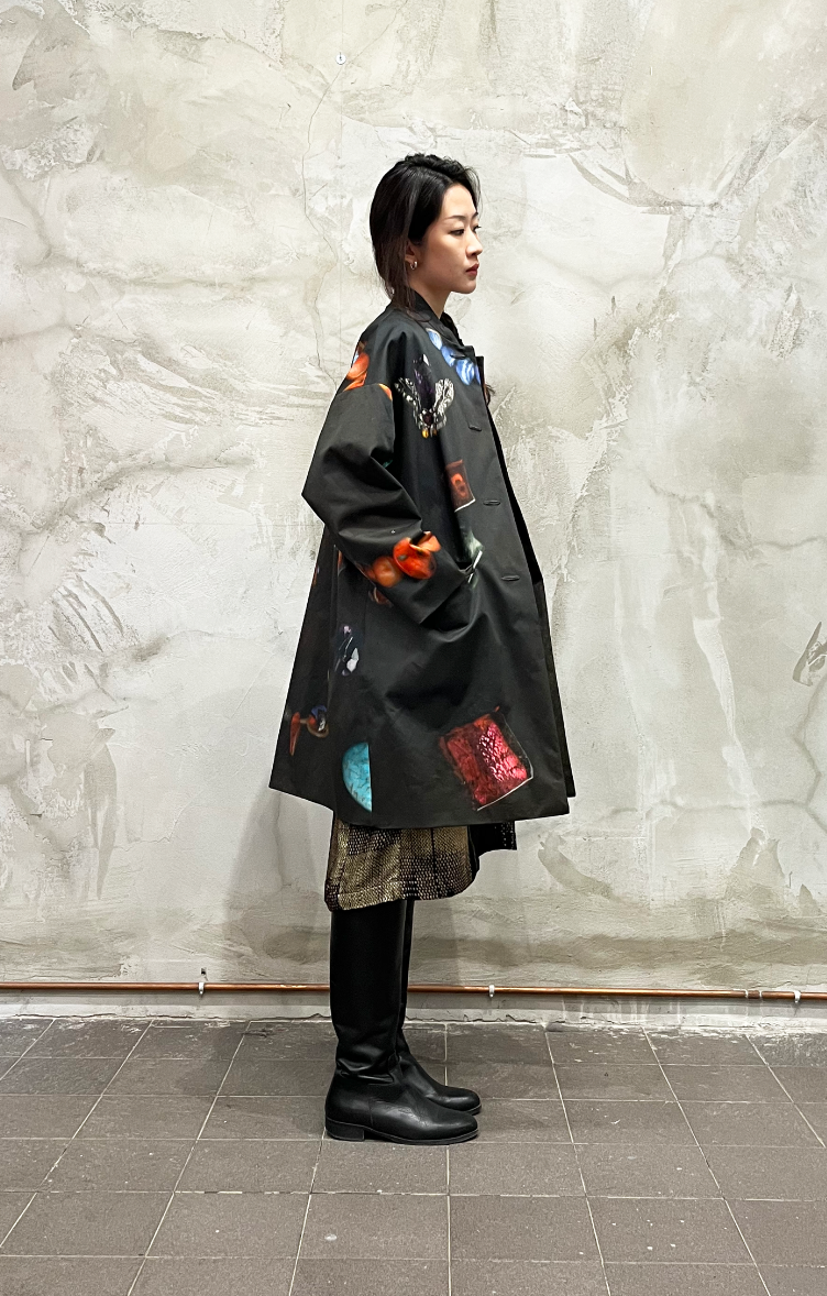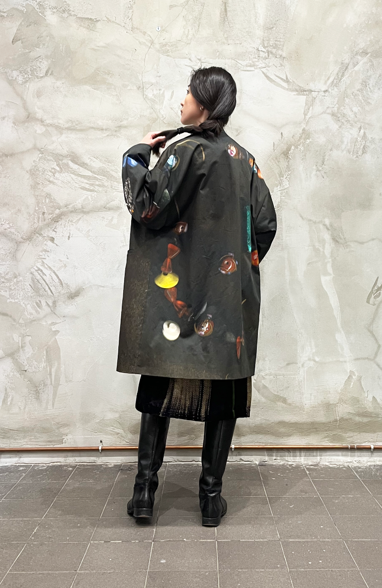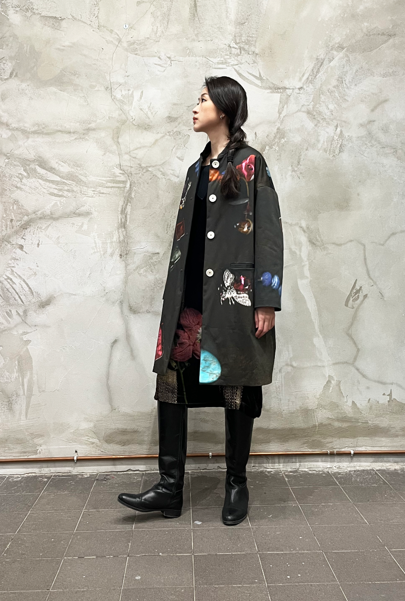 "Gioielli" printed cotton satin coat with frontal welt pockets and natural corozo buttons. Padded. Wide fit. Made in Italy.